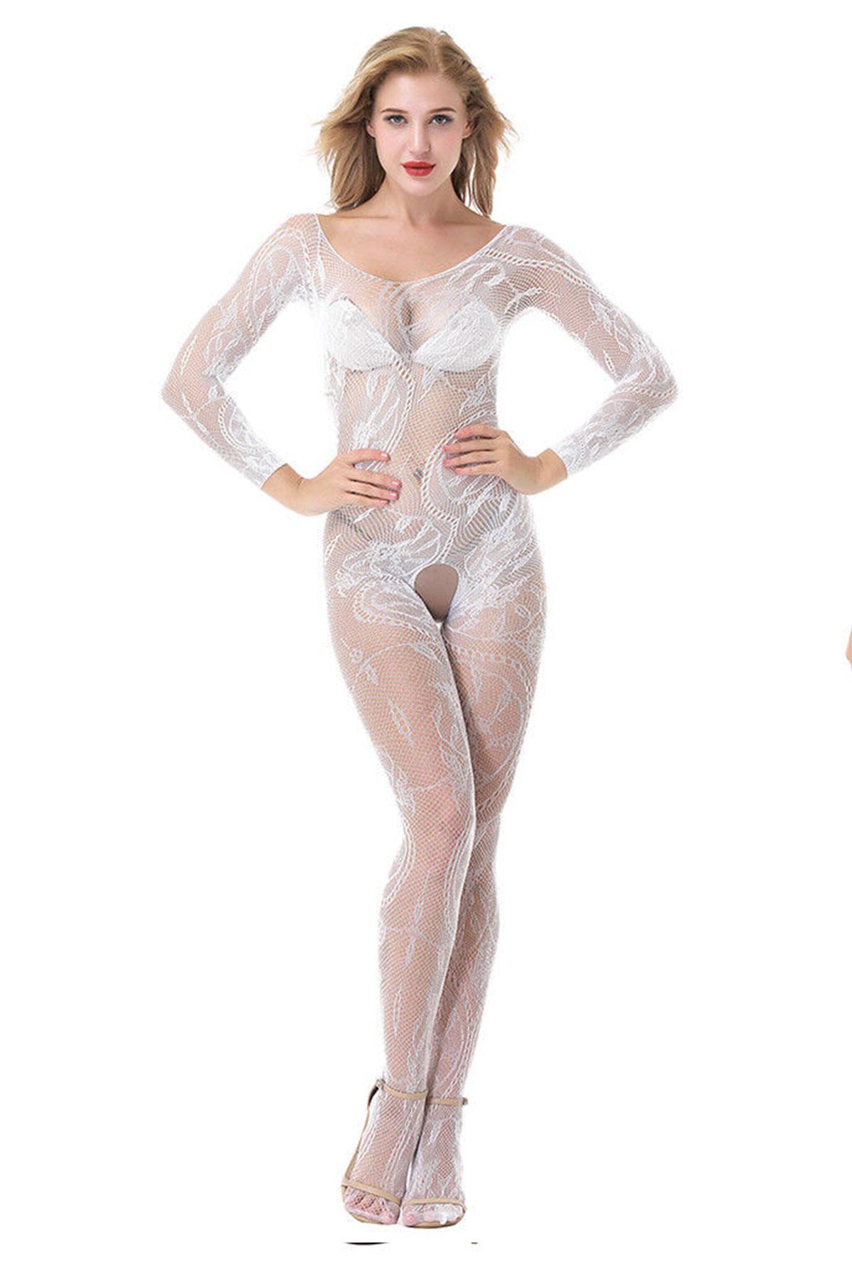 Siyah Çiçek Desenli Transparan Vücut Çorabı,Seksi Uzun Tulum Fantazi İç Giyim