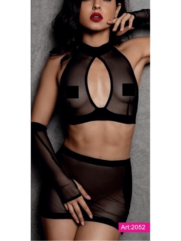 Özel Tasarım Transparan Büstiyer Kostüm Seti Peluş Detaylı File Çoraplı