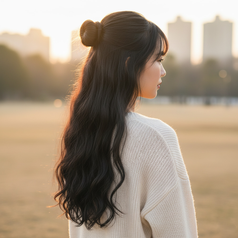 Fiber Sentetik Kabarık Dalgalı Yarım Ay + 2 Yan Çıt Çıt - Koyu Kumral Platin Ombreli