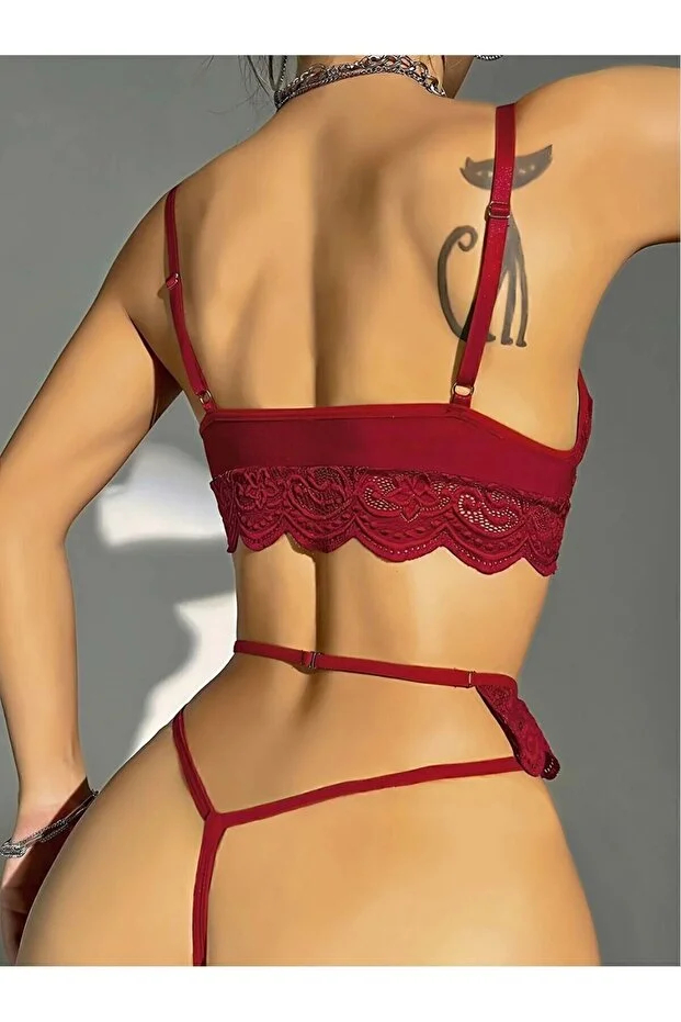 Kırmızı Dantel Jartiyerli 3’lü Fantazi İç Giyim Takımı, Transparan Ayarlanabilir Askılı,Kadın İç Giyim