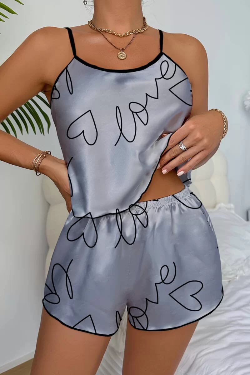 Love Baskılı Gri Saten Şortlu Gecelik Takım