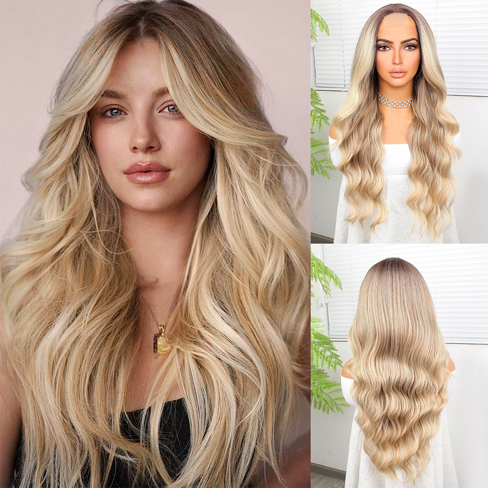 Kumral Platin Ombre ve Röfleli Fiber Sentetik Geniş Dalgalı Tül Peruk